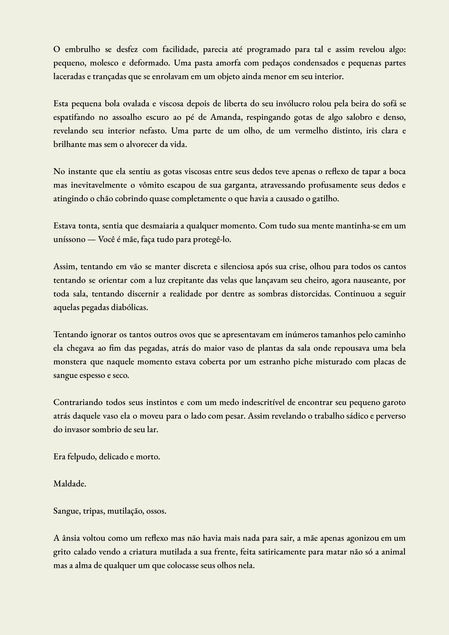Tentando ignorar os tantos outros ovos que se apresentavam em inúmeros tamanhos pelo caminho ela chegava ao fim das pegadas, atrás do maior vaso de plantas da sala onde repousava uma bela monstera que naquele momento estava coberta por um estranho piche misturado com placas de sangue espesso e seco.